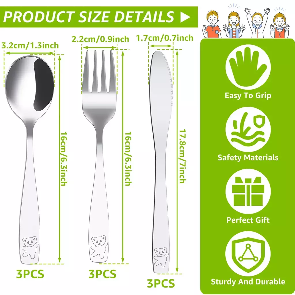 [?Informações de tamanho]O garfo mede 5,5 x 1,3 polegadas, as colheres medem 5,7 x 1 polegadas e o cortador de jantar mede 6,7 x 0,75 polegadas, que cabe na boca e nos dedos pequenos do seu filho, fácil de segurar e seguro de usar.É adequado para bebês, pré-escolares, crianças em idade escolar e adolescentes.